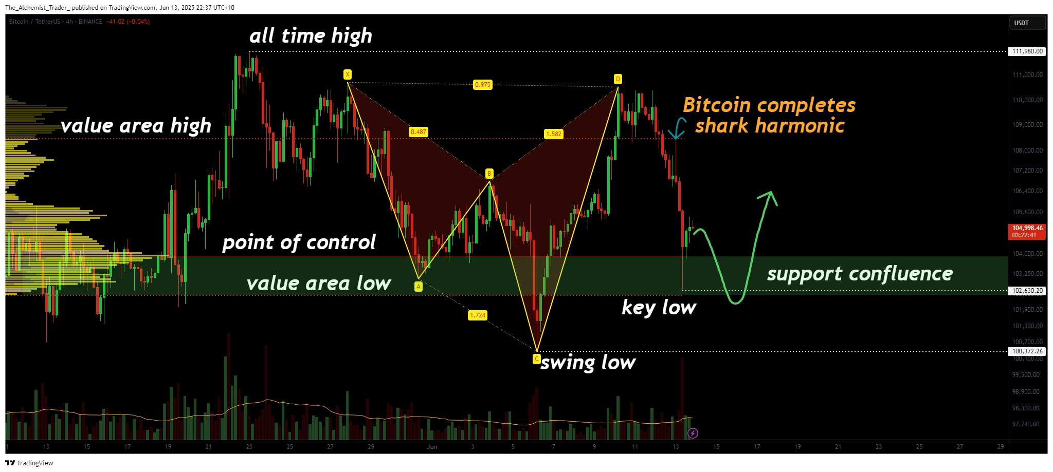 As information of a navy confrontation between Israel and Iran broke, world danger sentiment weakened, resulting in widespread liquidation throughout crypto markets. Nevertheless, beneath the floor, technical construction had already proven indicators of exhaustion. As predicted on June 10 on this evaluation article, a shark harmonic sample hinted at a full market rotation, which in the end performed out in textbook trend.