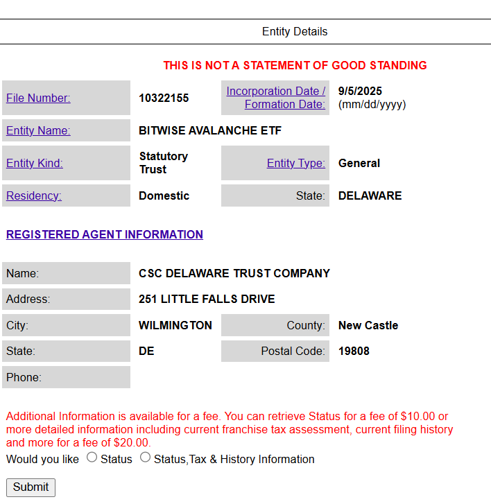 - Bitwise has registered a belief in Delaware for a possible spot Avalanche (AVAX) ETF.