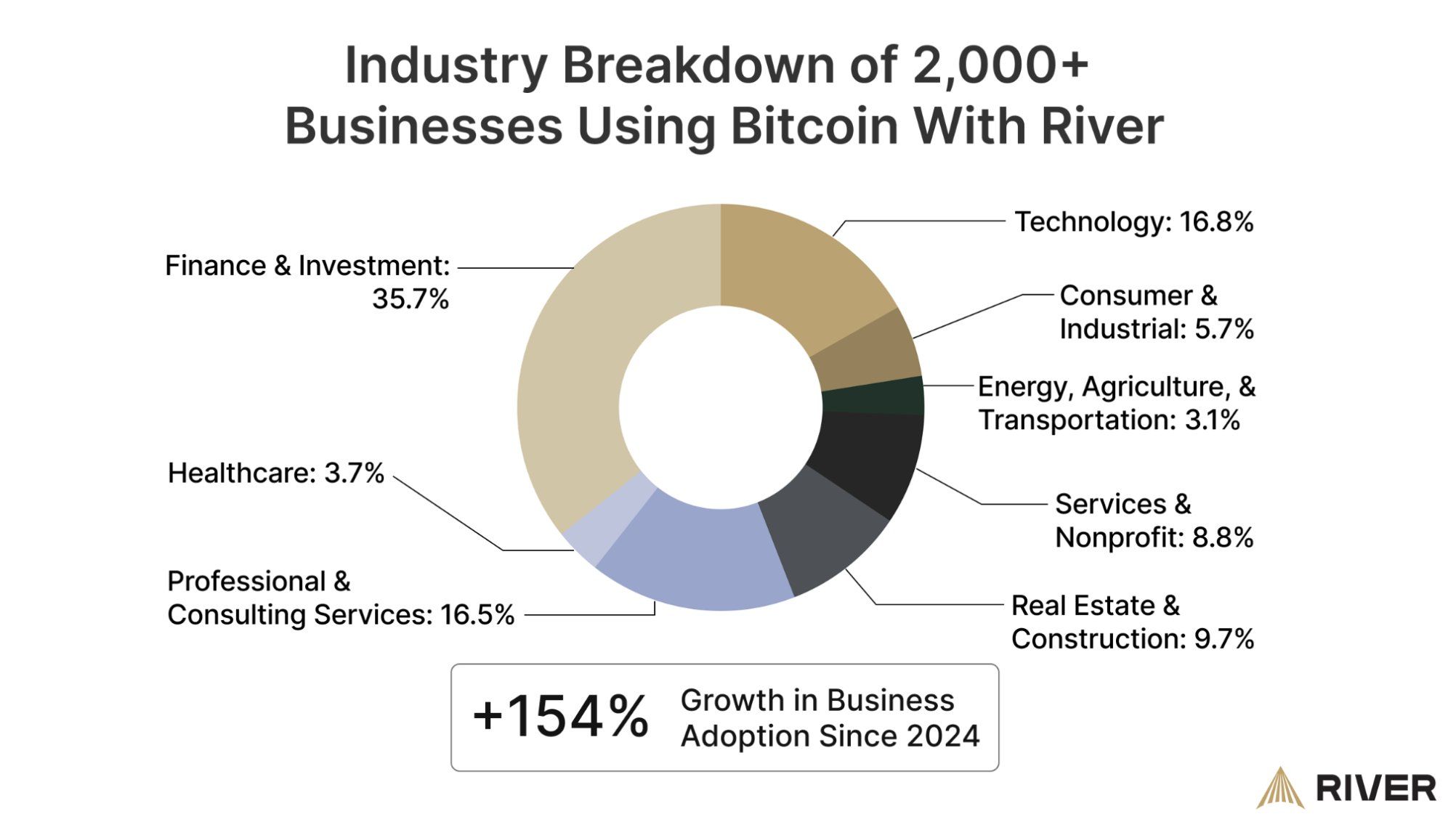 Based on River’s statistics, over 2,000 firms are utilizing the platform to build up Bitcoin, a powerful 154% development since 2024.